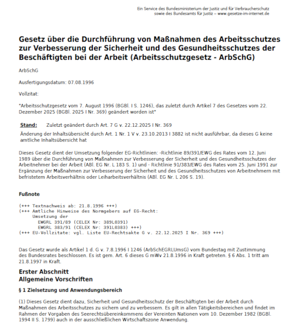 Arbeitsschutzgesetz in der Fassung vom 7. August 1996 (BGBl. I Nr. 1246), das zuletzt durch Artikel 7 am 22.12.2025 (BGBl. 2025 I Nr. 369) geändert worden ist.