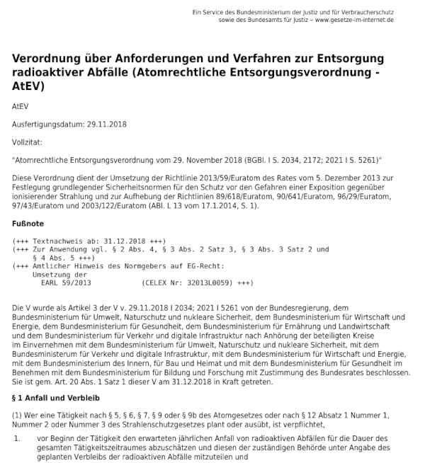 Verordnung über Anforderungen und Verfahren zur Entsorgung radioaktiver Abfälle (Atomrechtliche Entsorgungsverordnung AtEV) in der Fassung der Bekanntmachung vom 29. November 2018 (BGBl. I S. 2034, 2172; 2021 I S. 5261)