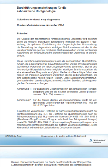 Diese Arbeitshilfe liefert Ihnen eine Empfehlung der Bundesärztekammer über Durchführungsempfehlungen für die zahnärztliche Röntgenologie. Diese Durchführungsempfehlungen fassen die zahnärztlichen Qualitätsforderungen, die Empfehlungen für die Aufnahmetechnik und die physikalischen und technischen Parameter der Bilderzeugungssysteme zusammen. Ziel ist eine hochwertige Bildqualität bei einer möglichst niedrigen Strahlenexposition, die eine einwandfreie Diagnostik ermöglicht. Hierbei sind berechtigte Schutzinteressen von Patienten, Anwendern und Dritten ebenso zu berücksichtigen, wie eine angemessene Kosten-Nutzen-Relation. Diese Durchführungsempfehlungen beschreiben den derzeitigen zahnmedizinischen Standard bei röntgenologischen Basisuntersuchungen.[