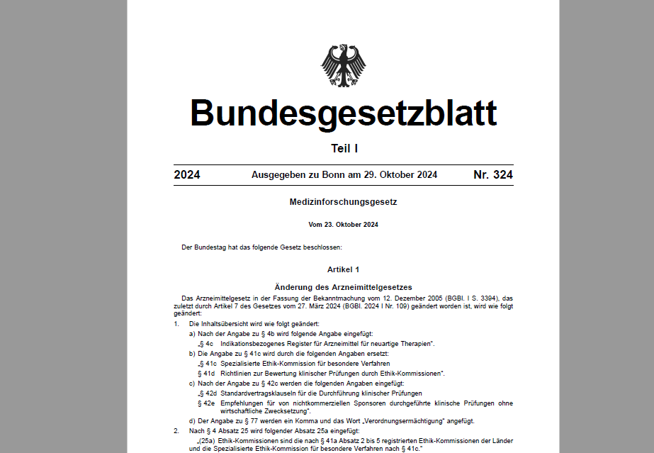 In der Arbeitshilfe finden Sie das Medizinforschungsgesetz vom 23. Oktober 2024 (BGBl. 2024 Nr. 324). Arbeitshilfen: |