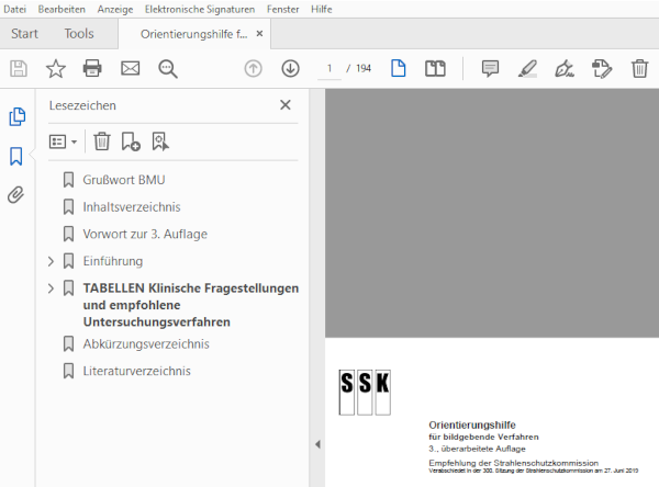 Diese Arbeitshilfe liefert Ihnen eine Orientierungshilfe der Strahlenschutzkommission für bildgebende Verfahren. Diese Empfehlung wurde am 27. Juni 2019 in der 300. Sitzung der Strahlenschutzkommission verabschiedet. Sie ist die Grundlage für die rechtfertigende Indikation, d. h. bei den dort angegebenen klinischen Fragestellungen wird angegeben, welches Untersuchungsverfahren das geeignete ist. Arbeitshilfen: |