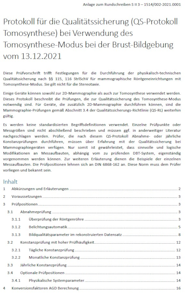 Die beigefügte Prüfvorschrift trifft Festlegungen für die Durchführung der physikalisch-technischen Qualitätssicherung nach §§ 115, 116 StrlSchV für mammographische Röntgeneinrichtungen mit Tomosynthese-Modus. Sie gilt nicht für die Stereotaxie.[