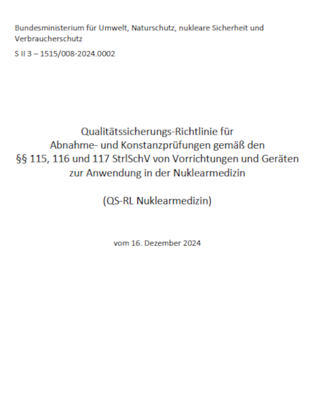 Der Fachausschuss Strahlenschutz (FAS) hat eine Neustrukturierung der Richtlinien zur physikalisch-technischen Qualitätssicherung beschlossen. Unterhalb einer übergeordneten Rahmenrichtlinie (Rahmen-RL QS) (s. Kap. 07070), die die allgemeingültigen Grundlagen und Konzepte beschreibt, werden die Grundsätze, Rahmenbedingungen und Umfang der physikalisch-technischen Qualitätssicherung im Rahmen der Abnahme- und Konstanzprüfungen nach §§ 115, 116 und 117 StrlSchV im Anwendungsgebiet der Nuklearmedizin in der eigenständigen und anwendungsbezogenen QS-RL Nuklearmedizin [1] definiert.