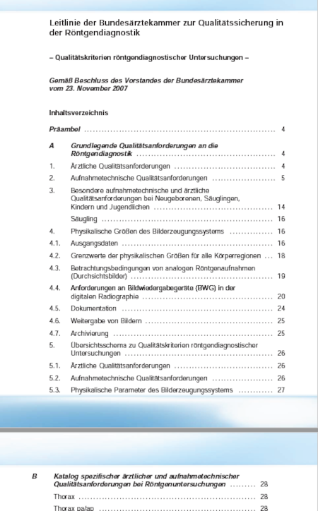 Diese Arbeitshilfe liefert Ihnen eine Leitlinie zu Qualitätskriterien röntgendiagnostischer Untersuchungen. Die Leitlinie fasst die ärztlichen Qualitätsanforderungen und die Empfehlungen für die gesamte radiologische Leistungskette zusammen, mit denen eine gute diagnostische Qualität zu erreichen ist. Sie gilt auch bei räumlicher und/oder personeller Trennung in der Durchführung der einzelnen Leistungsschritte. Diese Leitlinie beschreibt den derzeitigen medizinischen Standard und den Stand der Technik der radiologischen Basisuntersuchungen.[