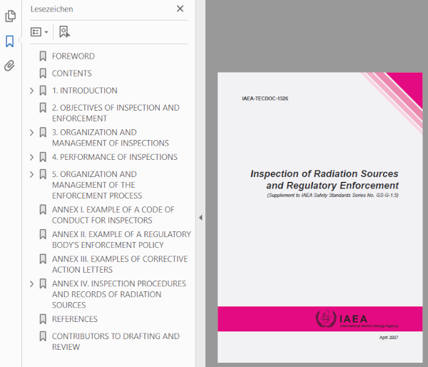 „Um in Erfahrung zu bringen, inwieweit Inspektionsprogramme bereits in den für den Vollzug der StrlSchV und RöV zuständigen Behörden der Länder vorliegen und wie diese umgesetzt und die Ergebnisse veröffentlicht werden, wurde ein Fragebogen entwickelt und an die zuständigen Behörden der Bundesländer versendet. Die Untersuchung ergab, dass in 47 % der für die StrlSchV zuständigen Landesbehörden, die auf die Umfrage geantwortet haben, ein risikoorientiertes Aufsichtsprogramm verfolgt wird. Bei den für die RöV zuständigen Landesbehörden beträgt dieser Anteil 36 %. Die Untersuchung bezüglich der Veröffentlichung von Aufsichtsprogrammen ergab, dass in 20 % der für die StrlSchV zuständigen Landesbehörden, die auf die Umfrage geantwortet haben, bereits Konzepte zur Veröffentlichung der Ergebnisse der Aufsicht existieren.” Aus den Auswertungen der GRS und den Werten der IAEA [2] ergeben sich Frequenzen für die behördliche Aufsicht in dem risikoorientierten Aufsichtskonzept.