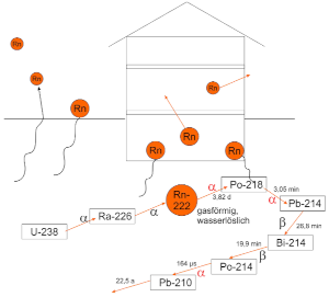 Aus dem Erdreich kommt Radon ins Freie und kann je nach Bauausführung und Dichtigkeit der Bodenplatte in Gebäude eindringen. Im Außenbereich ist die Radonkonzentration relativ gering, da es sich mit der Umgebungsluft vermischt (s. Abb. 2).